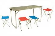 В комплект мебели входит складной стол и четыре табурета с сиденьями из полиэстера. Стол увеличенного размера идеально подходит для комфортного застолья. Высота стола регулируется по высоте в трех положениях (55, 60, 70 см). Оптимальный размер столешницы и дополнительные крепления с обратной стороны увеличивают прочность стола. Комплект собирается в чемоданчик. Имеет дополнительный чехол для транспортировки, что позволит избежать появления лишних царапин и дольше сохранит приглядный вид мебели.