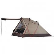 Двухслойная 4-х местная палатка с просторным тамбуром. У тамбура есть прозрачное окно, помимо двух вентиляционных окон, есть защитная юбка, защищающая от грязи. Быстро устанавливается за счёт отсутствия дугового каркаса. Палатка устанавливается на стойках.