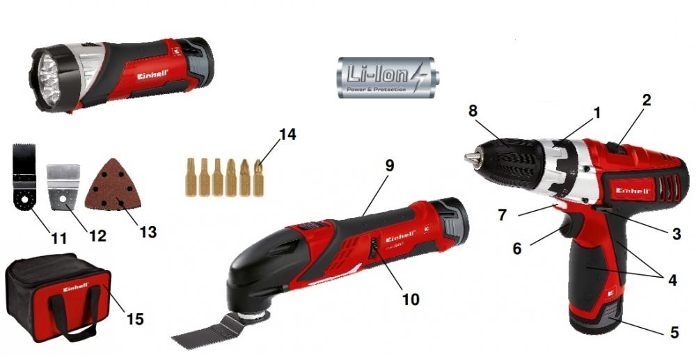 Стандартные комплектующие набора инструмента Einhell RT-TK 12 Li Kit:
