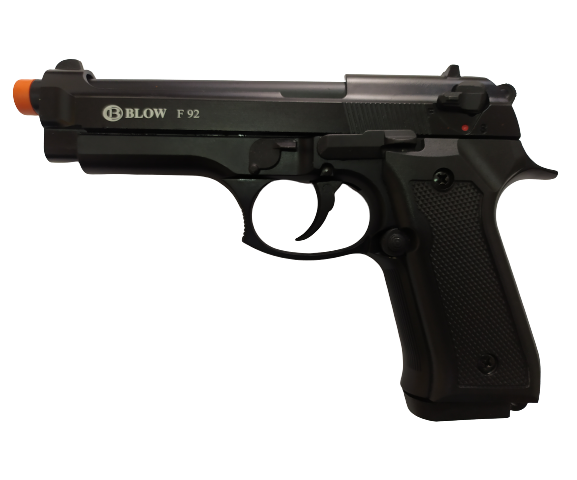 Blow F92 призначений для стрільби 9мм холостими патронами, а для відводу газів є дросельний отвір. Пістолет поставляється в пластиковому кейсі. Blow F92 дуже зручний в хваті і дає дуже гучний звук при стрільбі.