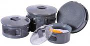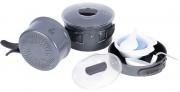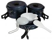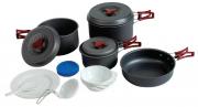 Набор посуды из анодированного алюминия для 2-3 человек, состоит из двух котелков, двух крышек-сковородок. В набор также входят комплект из мисок и чашек для трех человек, черпак и тряпка для мытья посуды. Набор упакован в удобный сетчатый чехол.