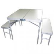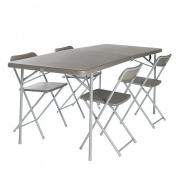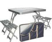 Крышкп стола изготовлена из алюминия. Каркас из легковесного алюминия с 4-мя алюминиевыми стульчиками. Легко собирается в компактный набор за считанные секунды. Нагрузка на крышку стола: 30кг. Нагрузка на стульчик: 100кг. Размеры: 97/162х82х39/73см. Вес: 11,9кг.