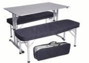 Крышка и каркас стола изготовлены из алюминия. Покрытие сидения из ДВП средней плотности с каркасом из алюминия. Размеры стола: 90/х52х55/73 см. Размеры скамейки: 94/х28,5х41 см. Нагрузка: 30 кг на крышку стола, 100 кг на стульчик. Вес: 10,75 кг. Прилагается чехол для трнспортировки.