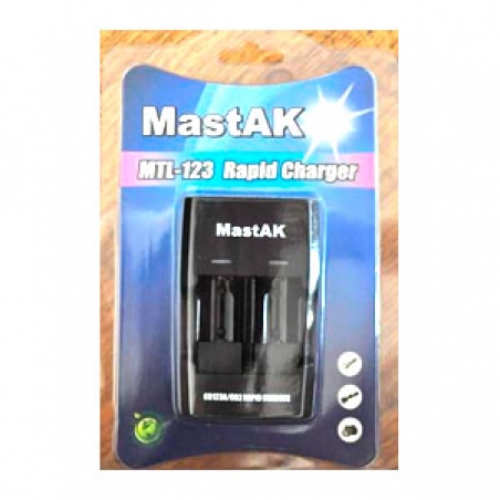 MastAK MTL-123 это интеллектуальное зарядное устройство для двух Li-ion аккумуляторов в размере RCR123 и RCR2 , Прибор имеет защиту от перезаряда и неправильно установленного аккумулятора. Зарядный ток составляет 300mA.Автоматическое отключение с индикацией "Красный"-"Синий"(заряжается-заряжено) Питание от сети 220В и от прикуривателя 12В.