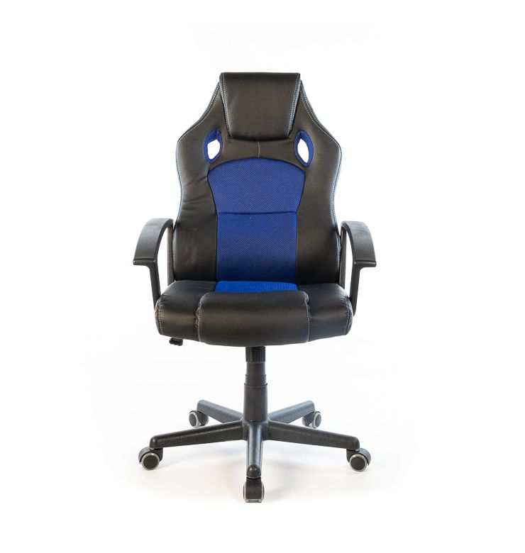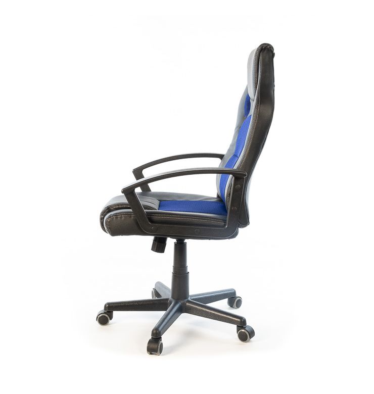 Современный дизайн кресла дополнен удачным выбором обивочного материала. Качественная экокожа черного и синего цвета цвета - это современный материал на натуральной хлопковой основе, по своим свойствам практически не уступающий натуральной коже. Контрастные вставки отлично освежают кресло, и оно станет настоящим ярким мазком даже в самом унылом офисном интерьере. Также такое кресло отлично подойдет для комнаты подростка, ведь оно и классно выглядит, и достаточно удобное и практичное. Механизм качания, установленный в данной модели, даст возможность прерывать работу или игру приятными сеансами расслабления, не вставая с любимого кресла. Газлифт поможет установить оптимальную для роста сидящего высоту сидения. В верхнем положении кресло имеет высокую посадку, что подойдет людям высокого роста. На широких дугообразных пластиковых подлокотниках установлены мягкие накладки - вашим рукам будет обеспечена надежная и комфортная опора. Пластик массивный и толстостенный, а значит достаточно прочный и рассчитан на интенсивные нагрузки в течении всего рабочего дня. Цельнолитая крестовина изготовлена из прочного толстостенного пластика с внутренними ребрами жесткости, что позволит ей выдерживать нагрузку более 120 кг. Поверхность пластика имеет слегка шероховатую текстуру, чтобы ноги не соскальзывали во время работы, а на пластике не оставались царапины от обуви. Прорезиненные роликовые опоры обеспечат креслу необходимую мобильность и подойдут для любого типа покрытия пола.