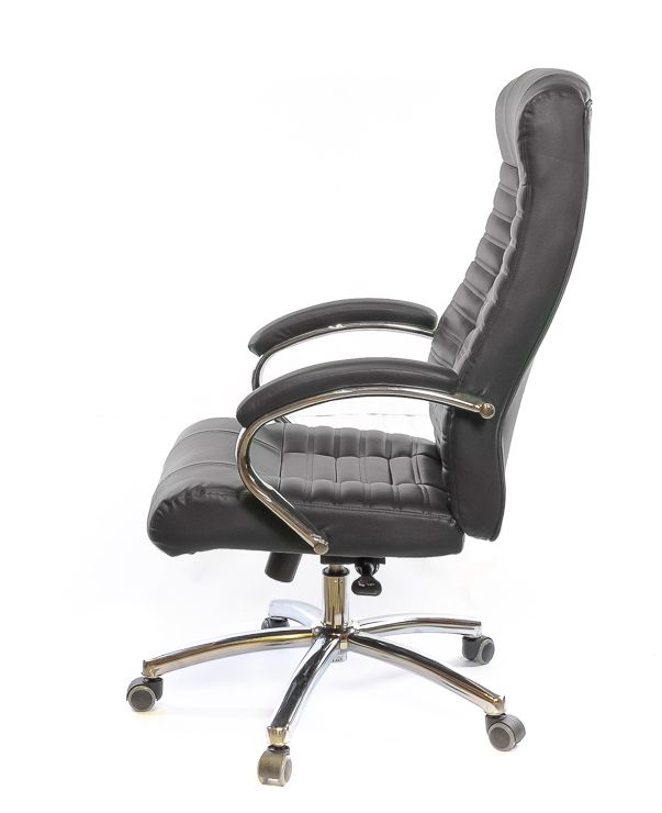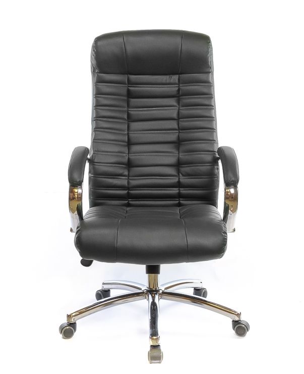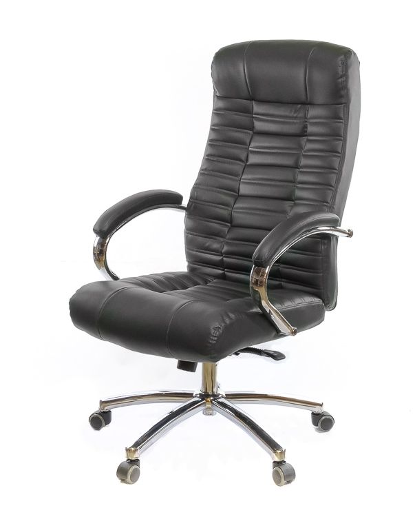 Крестовина кресла изготовлена из хромированного металла, который обеспечивает ему необходимую прочность и устойчивость. Хромированные элементы не потеряют свою красоту со временем, ведь покрытие очень прочное и стойкое к всевозможным внешним факторам. Мобильность такому габаритному креслу обеспечивают роликовые опоры. В данной модели используются универсальные прорезиненные ролики, которые подойдут для всех типов напольного покрытия. Модель имеет большие габариты, высокую спинку, глубокую и широкую посадку, а значит отлично подойдёт для людей и высокого, и среднего роста. Посадка достаточно удобная, сидение большое и мягкое. В основе сидения используется гнутоклееная фанера с поролоновым наполнением под обивкой. Углубление по центру сидения и скошенный передний край уберегут сосуды ног от пережимания, а ноги от накопления усталости к концу рабочего дня. Данная модель очень популярна и имеет несколько модификаций от недорогих с пластиковыми деталями до роскошных в коже и дереве.