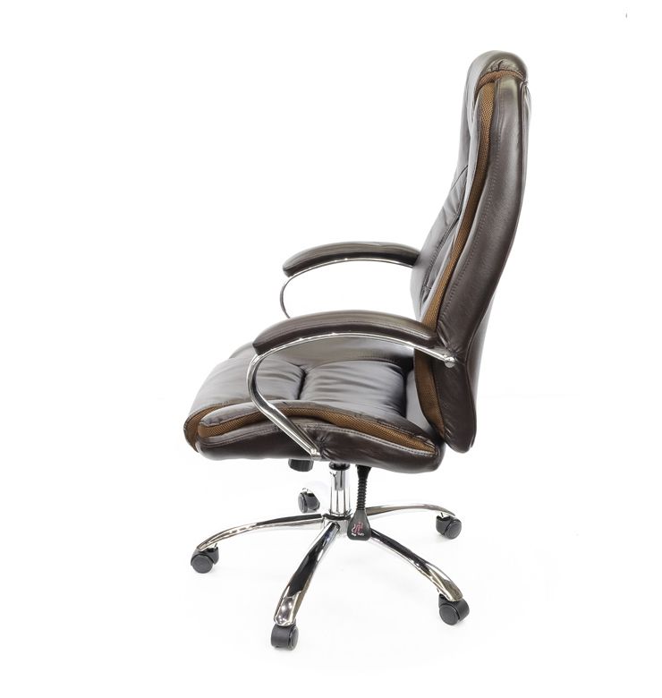 Крестовина данного кресла изготовлена из металла. Блестящее хромированное покрытие металла не только красивое, но и очень прочное. Такая крестовина очень прочная и может выдерживать нагрузку до 120 кг. Она не поддаётся механическим повреждениям, героически выдерживая постоянный контакт и с тяжёлой мужской обувью и со шпильками любимых туфель офисных модниц. Ролики обеспечат креслу необходимую мобильность. Для данной модели отлично подойдут ролики с хромированными накладками, которые по желанию можно заказать дополнительно. Спинка кресла достаточно высокая, хорошо подойдёт для человека выше среднего и высокого роста. Благодаря форме деревянного каркаса, мягкому наполнителю и дополнительным накладным подушкам на сидении и спинке вам обеспечена боковая и поясничная поддержка позвоночника, что снимает излишнюю нагрузку. Это поможет сохранить отличное самочувствие на протяжении всего пребывания в кресле. За счёт этого вы получаете комфортное рабочее место, в котором вам хочется задержаться подольше.