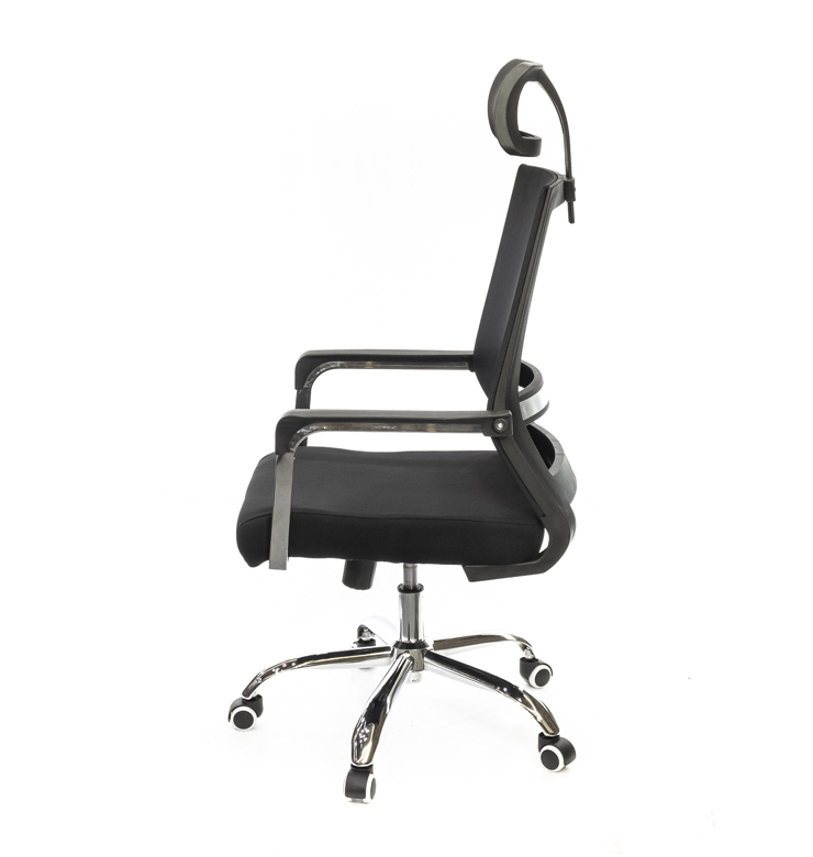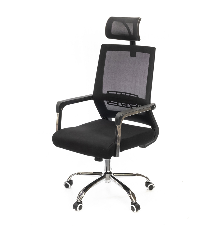 Крестовина. Дизайнерская крестовина кресла Хиос изготовлена из хромированного металла. Она цельнолитая, с четкими округлыми краями. Такая крестовина очень прочная и может выдерживать нагрузку до 150 кг. Блестящее хромированное покрытие металла не только красивое, но и очень стойкое. Оно не боится интенсивных нагрузок и не подвержено царапанию. Ролики обеспечат креслу необходимую мобильность. В данной модели они прорезиненные и подойдут для всех типов покрытий. Для данной модели также можно приобрести ролики с хромированными накладками, которые более гармонично будут смотреться с блестящей металлической крестовиной. Высокая эргономичная спинка имеет прогиб в поясничной области и специальную пластиковую пластину, которые обеспечивают вашей спине комфортную поддержку, а вам хорошее самочувствие даже в конце насыщенного рабочего дня. Боковая поддержка, сформированная каркасом, поможет обегать позвоночник и сохранит правильную осанку. В сидении кресла используется прочное основание из гнутоклееной фанеры, которое совместно с поролоновым наполнением формируют удобную посадку. Подголовник, состоящий из изогнутой пластиковой рамы и сетчатой обивки, крепится к верхней части спинки. Подголовник удобный, дугообразной формы. Он регулируется по высоте с помощью винтового крепления.