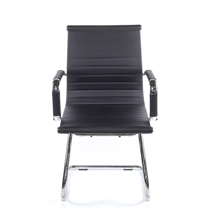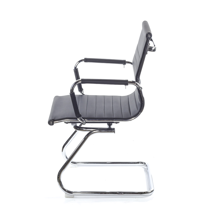 Обивка у этого кресла - это экокожа, современный материал высокого качества на хлопчатобумажной основе. Она достаточно прочная, воздухопроницаемая, эластичная и приятная на ощупь. По своим качествам экокожа практически не уступает натуральной коже и имеет при этом привлекательную цену. Этот материал неприхотлив в уходе и отлично справляется в интенсивной нагрузкой в условиях бешеного ритма современной офисной жизни. У данной модели оригинальные подлокотники из плоской металлической трубы. Высота подлокотников подобрана таким образом, чтобы в нижнем положении сидения кресло можно было задвинуть под рабочий стол и освободить пространство возле стола. Съемные кожаные чехлы уберегут ваши руки от контакта с холодным металлом. П-образное основание данной модели изготовлено из гнутой металлической трубы. Оно прочное, устойчивое и рассчитано на нагрузку до 100 кг. Блестящая полированная поверхность металла не боится больших нагрузок, царапин и сколов благодаря стойкому хромированному покрытию. Форма основания позволяет креслу немного пружинить, создавая эффект лёгкого покачивания. Для защиты напольного покрытия в кресле использованы пластиковые заглушки. Эргономика конструкции – еще один плюс данной модели. Каркас кресла их металлической трубы имеет небольшой прогиб в поясничной области, что обеспечивает правильную поддержку позвоночника. Кресло в меру жесткое, а значит, будет беречь вашу спину от усталости и сохранит правильную осанку. Металлическая поперечная планка на спинке кресла - это не только элемент декора. Она увеличивает жесткость конструкции, а также ее можно использовать как удобную ручку для перемещения кресла.