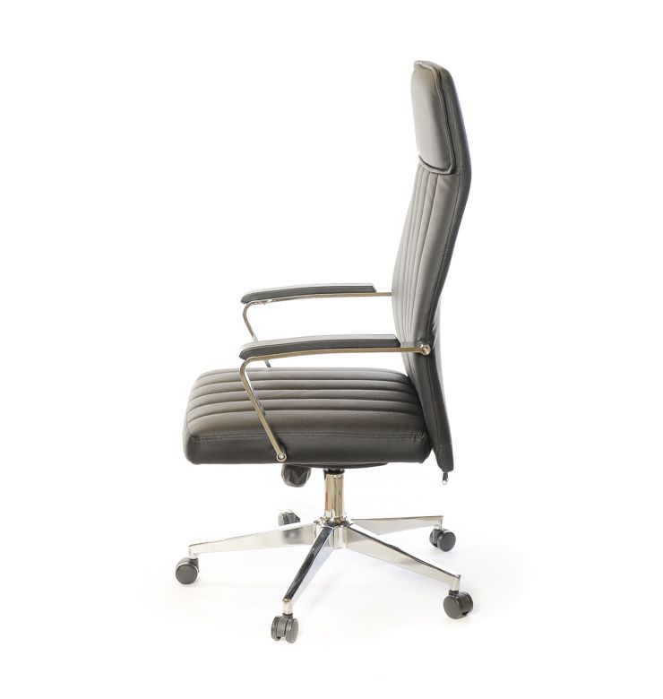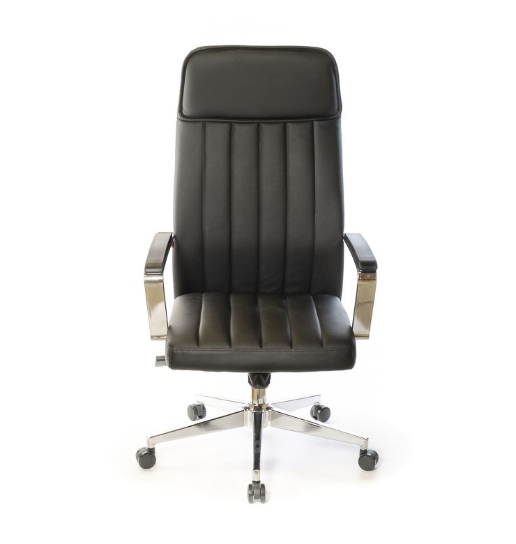 Металлическая крестовина, которая стоит на данном кресле, отлично выдерживает нагрузку до 120 кг. Лучи крестовины имеют четкую прямую форму, которая перекликается с формой подлокотников и формирует завершенный элегантный силуэт кресла. Кресло легко передвигается благодаря универсальным прорезиненным роликовым опорам, которые подойдут для всех типов напольного покрытия. К данной модели можно также приобрести ролики со специальными хромированными накладками, которые отлично дополняют внешний вид кресла. Кресло достаточно массивное, с высокой спинкой, а значит отлично подойдет даже для покупателей высокого роста и среднего роста. Монолитное основание спинки имеет эргономичный прогиб в поясничной области, что обеспечит вашей спине комфортную поддержку и снимет нагрузку с позвоночника. Подголовник высокий, интегрированный в спинку.