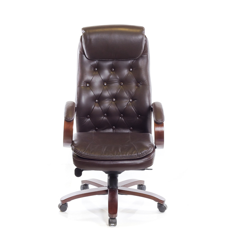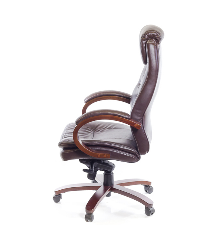Подлокотники из натурального дерева имеют овальный изгиб и не только прекрасно дополнят внешнюю красоту кресла, но и обеспечат Вашим рукам надёжную опору. Мягкие накладки обтянуты натуральной коже в тон основной обивке кресла. Благодаря мягкому наполнению из мебельного поролона они подарят вам чувство максимального комфорта. За красивыми декоративными накладками из натурального дерева прячется прочный металлический каркас крестовины. Благодаря ему креслу обеспечена надёжность и устойчивость. Деревянные детали тщательно обработаны и покрыты тонировочным противоударным лаком - ваше кресло долгое время будет оставаться в безупречном состоянии и радовать вас. Несмотря на большие размеры, кресло легко передвигается с помощью роликов. Для данной модели отлично подойдут ролики со специальной юбочкой, за которой прячутся колёсики. Эти ролики отлично вписываются в дизайн кресла. Спинка кресла имеет правильный изгиб в поясничной области, благодаря чему снимается нагрузка с позвоночника и вы будете продуктивно и комфортно работать, абсолютно не чувствуя усталости даже в конце рабочего дня. Комфортное сидение настолько мягкое, что вы буквально утопаете в нем. Такой эффект создан благодаря мебельному силикону, который использован в накладных подушках кресла.