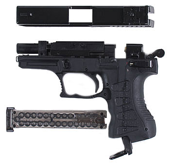 - Прозрачный магазин позволяет производить стрельбу в любой позиции: он очень просто вставляется и извлекается из рукоятки, как в боевом оружии