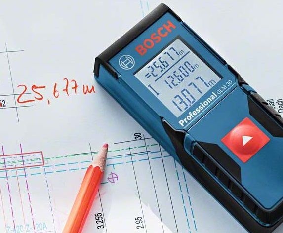Лазерная рулетка дальномер BOSCH GLM 30 Professional с всего одной кнопкой управления. Простой в работе, простой функционально, но поэтому и максимально доступный лазерный дальномер профессионального класса имеет класс защиты IP54. Дальность измерений до 30 метров с допустимой погрешностью 2 мм на всей длине. Пожалуй, модель GLM 30 Professional можно считать самым доступным дальномером в профессиональном классе в мире! Конечно, наборфункций в нем значительно ограничен, но если Вам нет необходимости проводить сложные замеры и вычисления данным прибором, то Вы вполне обойдетесть моделью BOSCH GLM 30 и при этом хорошо секономите.