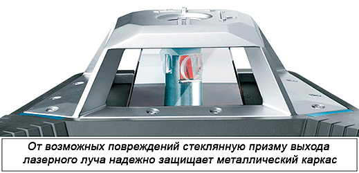 Влаго- и пыленепроницаемый корпус строительного лазера надежно защищен металлическим каркасом. Упав с метровой высоты, он остается целым и функционирующим.