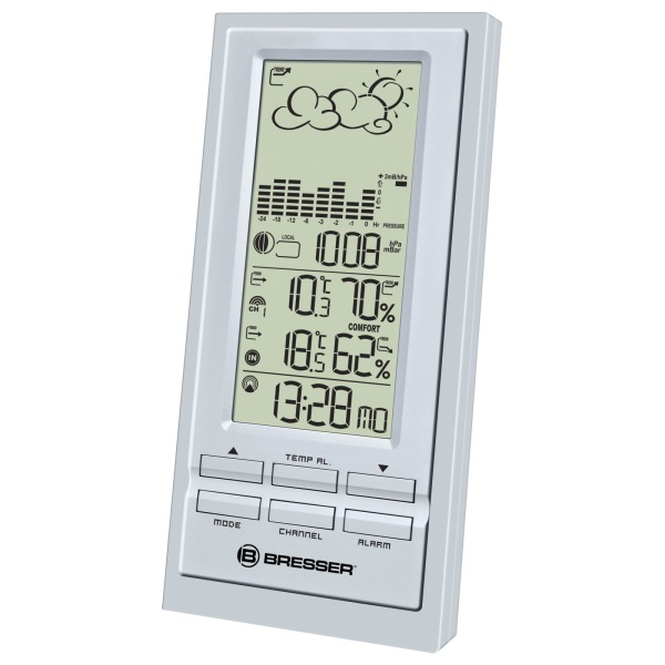 Метеостанция Bresser TemeoTrend NBF отображает не только текущую погоду, но и прогноз на ближайшие часы. Эта погодная станция даёт представление о таких важных климатических параметрах, как температура, влажность и давление. Важно, что все эти данные метеостанция фиксирует как в помещении, так и на улице. А возможность подключения до трёх датчиков позволяет охватить довольно широкую площадь для измерения данных.