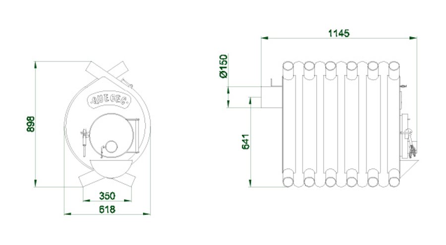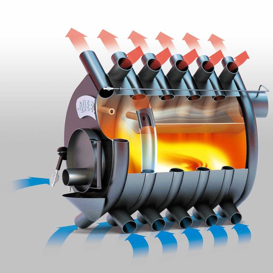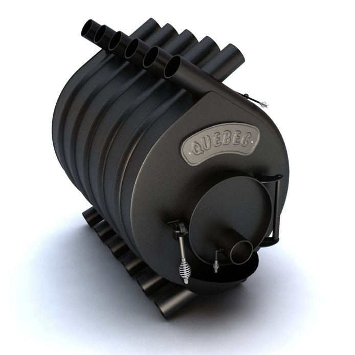 Булерьян Quebec тип 03 работает на твердом топливе — дровах, древесных отходах, торфе, брикетах и т. п. Может быть использована, как источник тепла в жилом или производственном помещении. Принцип работы как в газогенераторе — тлеющее горение. Сконструирован таким образом, что за счет конвекции самостоятельно смешивает воздух по всему объему. Через трубки снизу засасывается холодный воздух, а через ряд верхних труб выбрасывается воздух подогретый до 60-80 градусов. Не смотря на это температура поверхности самой печки остается весьма низкой, никогда не раскаляется. Отличается своей экономичностью, за счет сжигания топлива в два этапа. Первая камера предназначена для процесса тления и образования печных газов, вторая для сжигания газов благодаря подаче вторичного воздуха через специальные форсунки. Происходит полное сгорание и КПД 70-75%. На полной загрузке печь способна проработать 8-12 часов. Работает без присмотра. Пожаробезопасность обеспечена герметически закрываемой дверцей и низкой температурой поверхности. При установке в жилых помещениях её можно отделать в виде камина и вывести монтаж воздушного отопления по всему помещению.