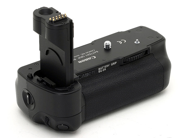 Рукоятка Canon BG-E4 выполнена из того же материала, что и сама фотокамера Canon EOS-5D - из магниевого сплава. В неё умещается либо 2 аккумулятора Canon, либо 6 аккумуляторов/батарей типа AA. Рукоятка Canon BG-E4 снабжена кнопкой спуска затвора, кнопкой блокировки AE/FE, селектором точки автофокуса и главным управляющим колёсиком.