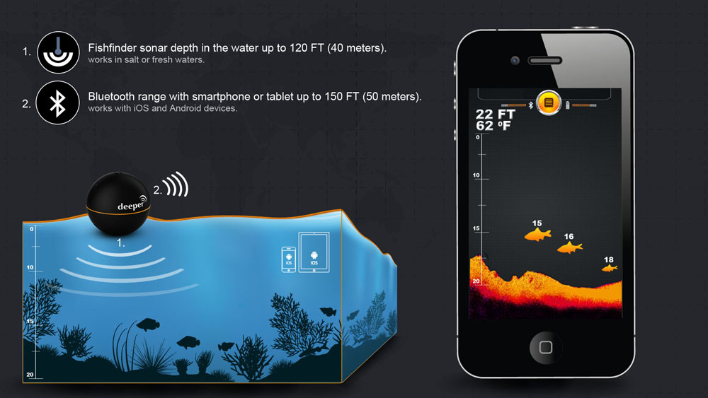 Представляем Вашему вниманию беспроводной Bluetooth эхолот Deeper который работает совместно с планшетами и смартфонами на операционных системах Android 2.3+ и iOS 5.0+.