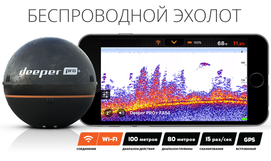 Умный Эхолот Deeper PRO+ использует Wi-Fi для более точной передачи данных на ваше мобильное устройство. Вам не потребуется ни сигнала сотовой сети, ни использования 3G. Дальность WI-FI соединения достигает 100м