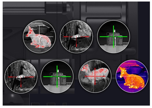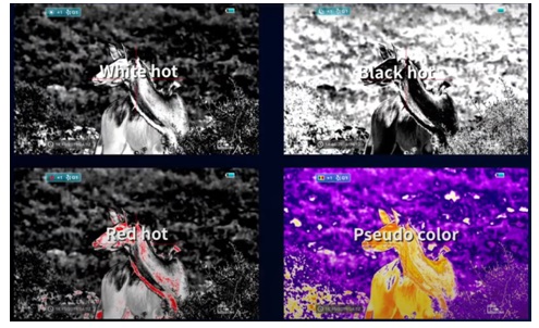 Палитры с контрастными горячими оттенками: «White Hot», «Black Hot» и «Red Hot» прекрасно справляются при поиске целей в плохих погодных условиях на широких открытых пространствах. Для точной идентификации цели и определения ее трофейности рекомендовано использование цветной палитры «Pseudo color», в которой по глубине цвета можно выделить наиболее «теплые» места на поверхности цели. Переключение между цветовыми палитрами производится в быстром меню прицела.