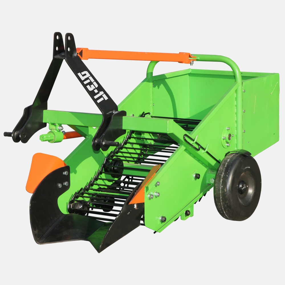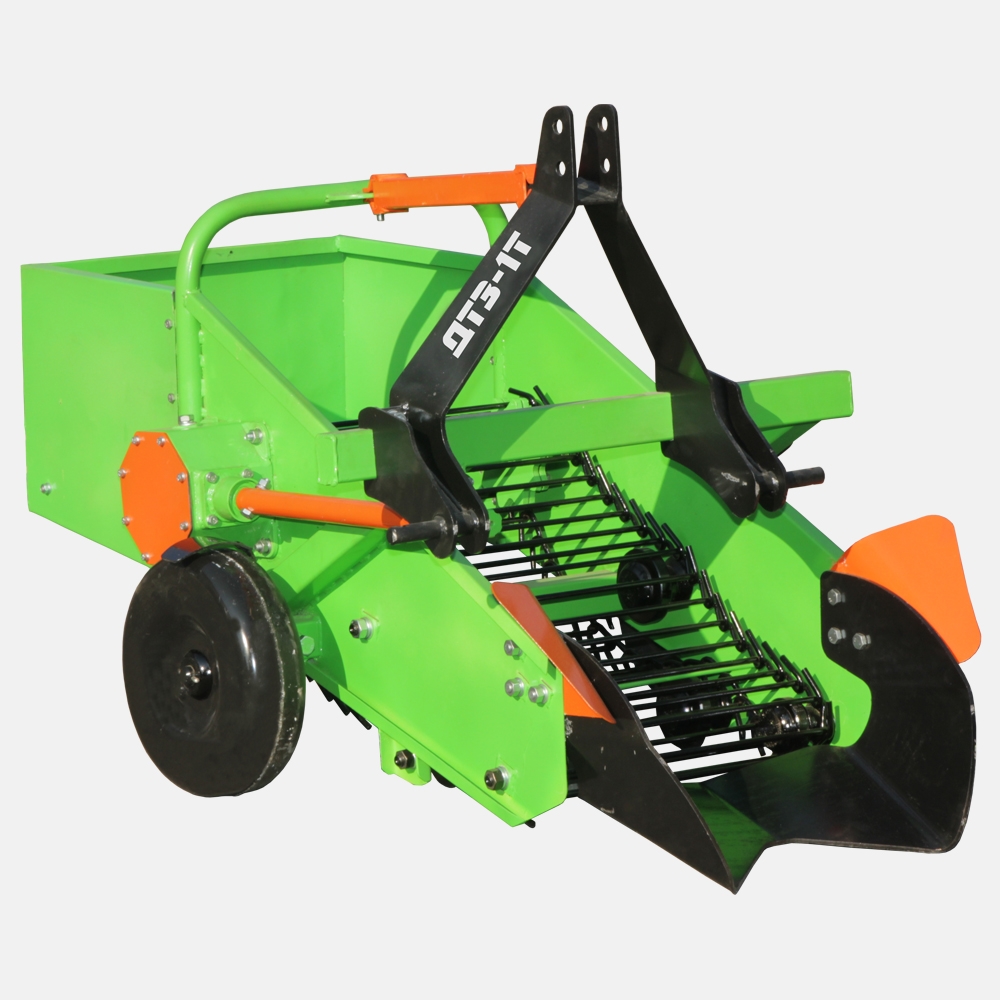 Картофелевыкапыватель навесной транспортерный однорядный используется для высокопроизводительной механизированной уборки картофеля и других корнеплодов, высаженных рядным способом с глубиной залегания до 15 см. Устанавливается на 3-точечную навесную систему, с помощью карданного вала стандартной длины подключается к валу отбора мощности трактора. Имеет жесткий корпус, в котором смонтирован транспортер из прочных металлических прутьев круглого сечения. Транспортер собран без применения каких-либо соединительных элементов, его звенья цепляются непосредственно друг за друга, поэтому он отличается исключительной эффективностью, надежностью и долговечностью. В движение транспортер приводится через закрытый конический редуктор, все подшипниковые узлы ведущей оси и поддерживающих роликов также находятся в закрытых корпусах. Нож изготовлен из цельного листа металла методом объемной штамповки. Он имеет сложную инновационную форму режущей кромки, обеспечивающую опти-мальный профиль канавки и подрезку боковых стенок. В задней части корпуса установлена отбойная гребенка, направляющая поток корнеплодов в нужную сторону. Максимальная глубина выкапывания ограничивается опорными колесами, ширина колеи которых варьируется от 80 до 130 см. Также можно настраивать поперечное положение картофелевыкапывателя относительно трактора.
