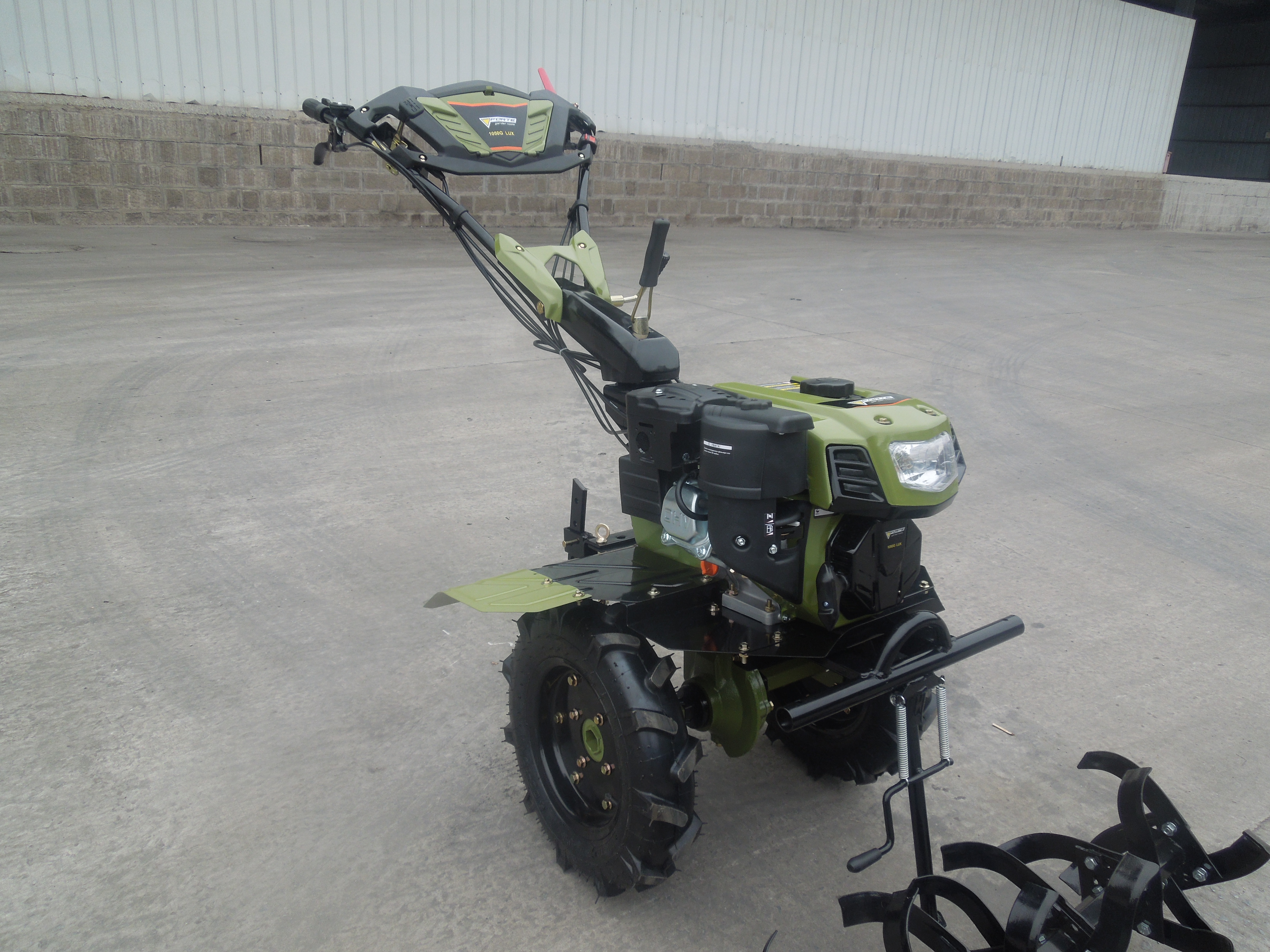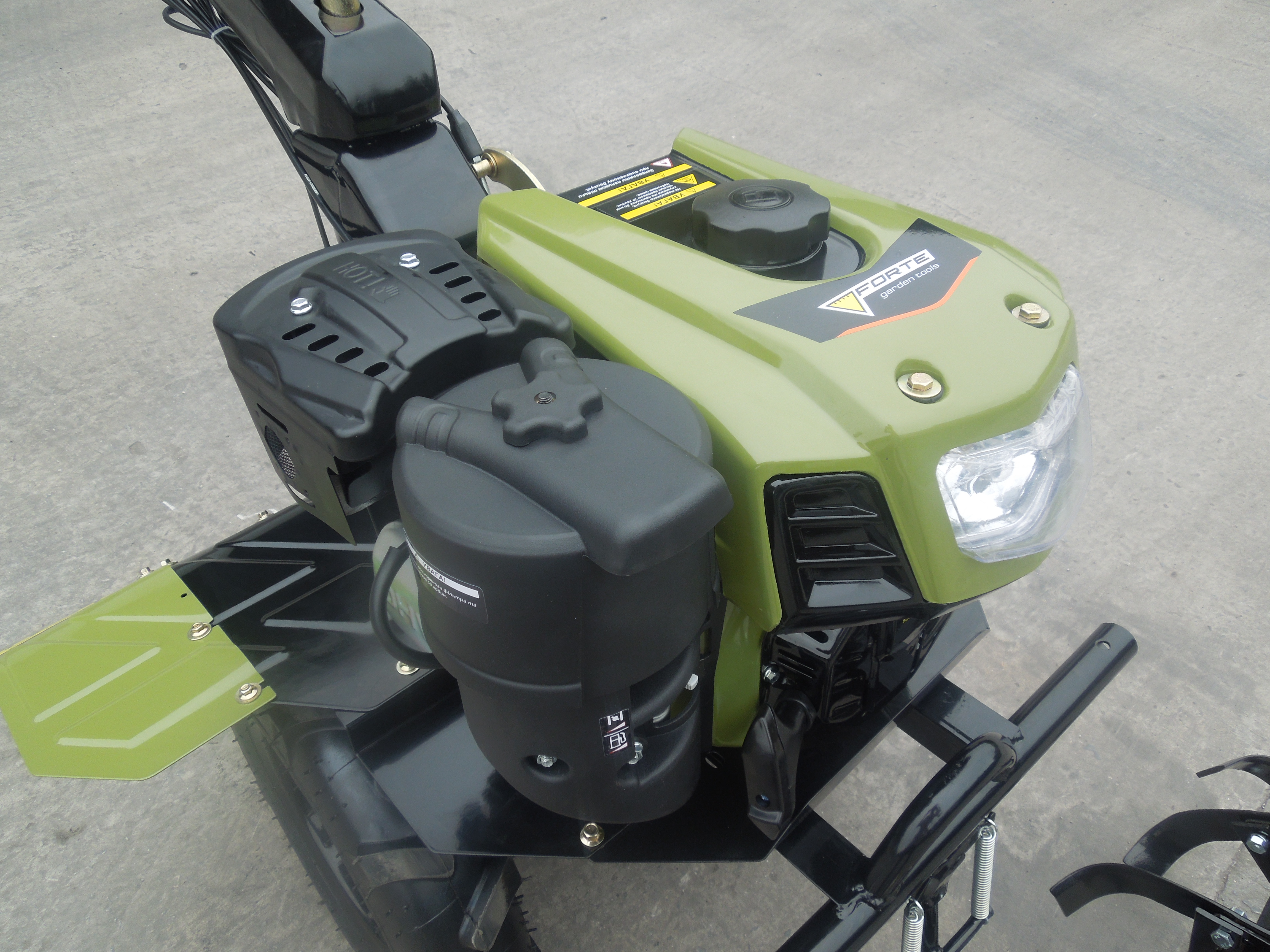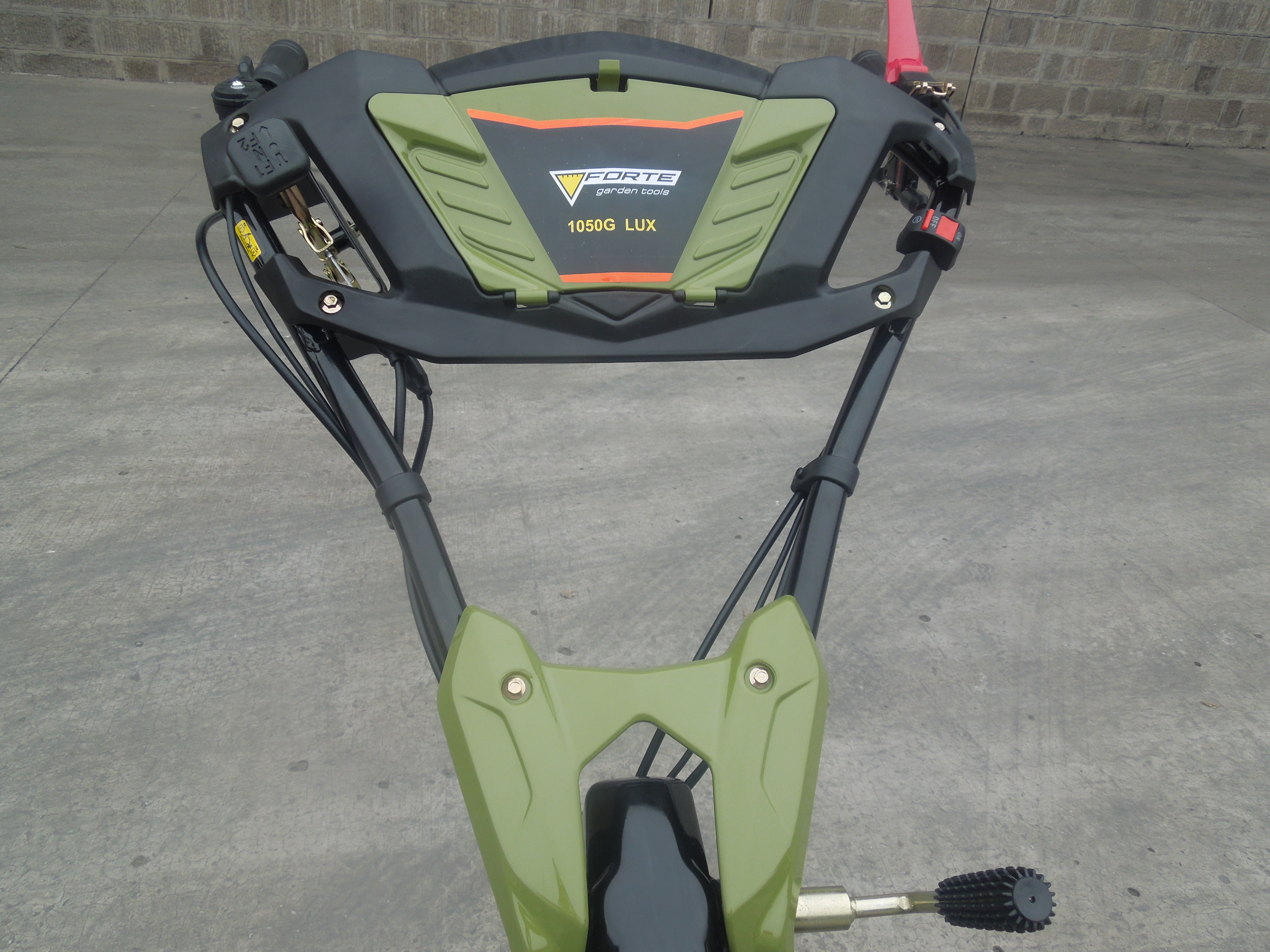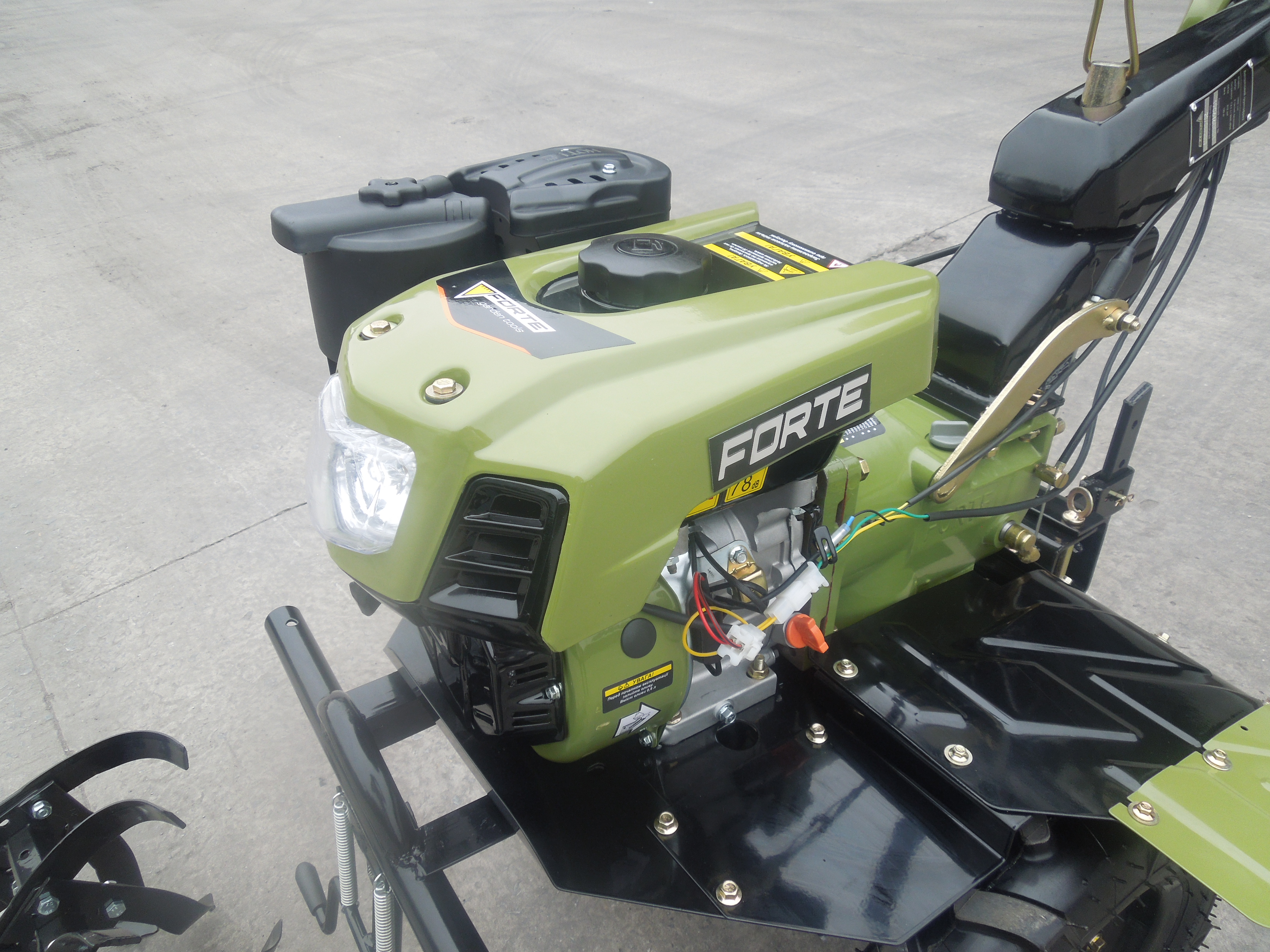 Мощный бензиновый мотоблок FORTE 1050G , предназначен для работы на больших открытых площадях (до 1 Га). Благодаря великолепному сочетанию цены и широкоформатности, его можно назвать, одним из самых продуктивных устройств, работу которого по достоинству оценили не только простые владельцы крупных участков земли, но и фермеры профессионалы.Главная особенность оборудования - выносливый четырехтактный бензиновый двигатель с принудительной системой воздушного охлаждения. Мощность мотора при максимальных оборотах 3600 об/мин составляет 6.5 л.с. Такой производительности вполне достаточно, чтобы охватить полный спектр садово-огородных работ.Также стоит отметить экономный расход бензина. При объеме бака в 5.05 литра, эксплуатационные затраты более чем экономичны - всего 0.7 литров за 1 час работы. Благодаря слегка сдвинутому вперед мотору, многодисковому сцеплению в масляной ванне, зубчатой коробке передач, трансмиссии без цепей и ремней, производителю удалось добиться максимальной скорости и еще большего качества работы.Наличие вала отбора мощности, предоставляет возможность использовать различное навесное оборудование. Таким образом, Вы можете производить не только традиционную культивацию почвы, используя саблевидные фрезы, но и вспахивать землю, осуществлять посев, окучивать, пропалывать, сажать и собирать урожай.Не остается без внимания и ширина культивации. За один подход бензиновый мотоблок FORTE способен охватить полосу шириной в 105 см, глубина погружения при этом составит 30 см. В модели реализованы 2-е скорости работы и возможность заднего хода. Руль регулируется по высоте и поворачивается на 360 градусов, позволяя выбрать оптимальное положение для комфортной работы. Несмотря на то, что двигатель запускается посредством шнура ручного стартера, техника заводится в любую пору года без каких-либо проблем.