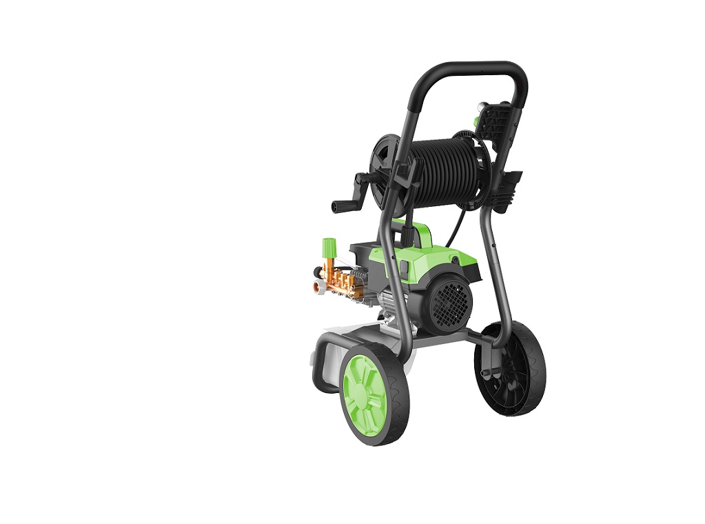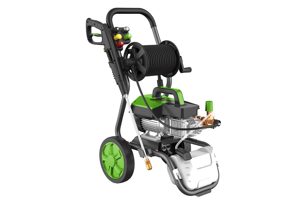 Система автоматического отключения при отсутствии воды. Металлическая помпа и соединители. Триосевой поршневой насос. Поршни из закалённой нержавейки. Двигатель с алюминиевым корпусом. Функция самовсасывания. Профессиональный пистолет с системой блокировки. Катушка для шланга.