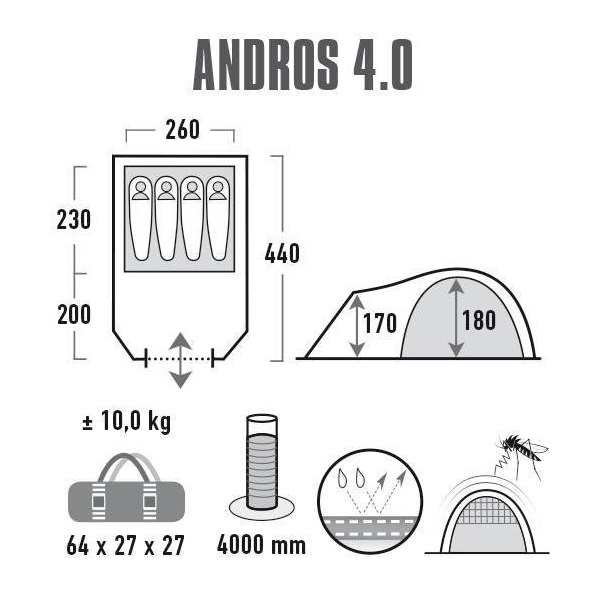 Кемпинговая палатка High Peak Andros 4.0 оборудована двумя регулируемыми системами вентиляции Dual Flow Vent System и Vario Vent Control. Данные системы позволяют создать в палатке максимально комфортный микроклимат при любых погодных условиях. Затемненная спальня способствует комфортному отдыху не только ночью, но и в дневное время суток. Просторный тамбур позволяет легко разместить туристический инвентарь или организовать кемпинговую кухню. Прозрачные окна со шторами, антимоскитные сетки на входе в палатку и в спальный отдел, проклеенные швы, водозащита от дождя в 4000 мм и многое другое позволят использовать палатку полноценно как в базовом лагере, так и для семейного отдыха на природе.