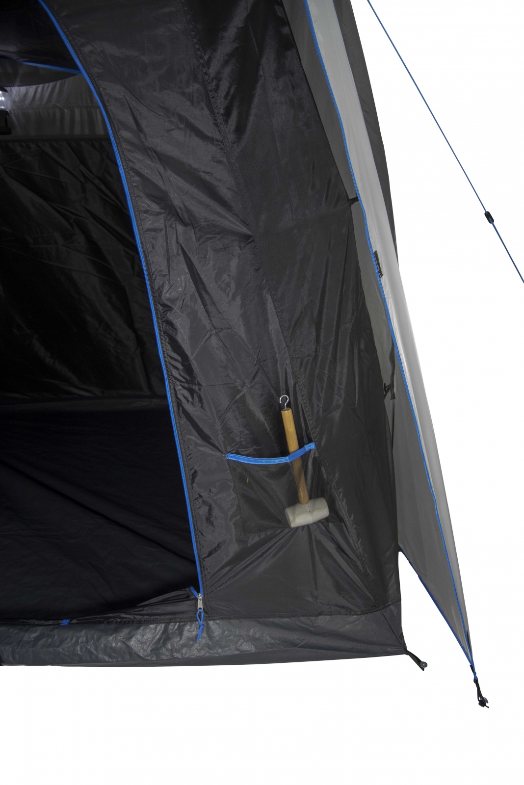 Ярко-синие маркеры по периметру палатки и в натяжных шнурах способствуют улучшению ориентации на местности в темное время суток