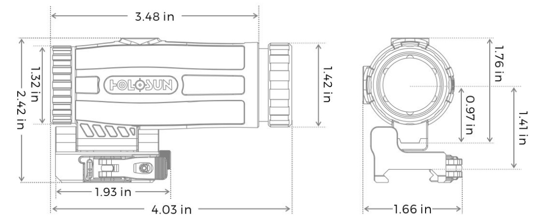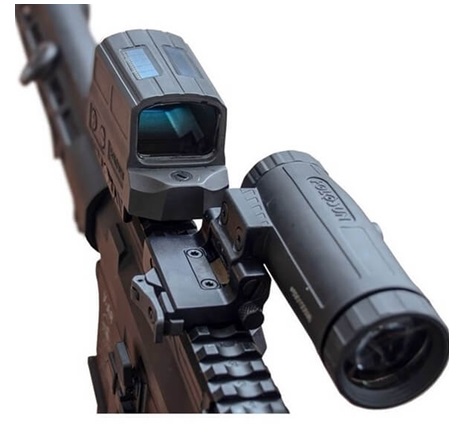 Magnifier Holosun HM3X поставляется с быстросъемным типом крепления на рельсовые системы Вивера / Пикатини. Защелка, удерживающая прибор в рабочем положении, находится в доступности, позволяя откидывать и возвращать увеличитель в считанные мгновения. В комплекте имеется специальная проставка, для адаптации под коллиматоры с разной величиной оптической оси: 37 мм (Co-witness) или высокой 41,6 мм (Lower 1/3 co-witness).