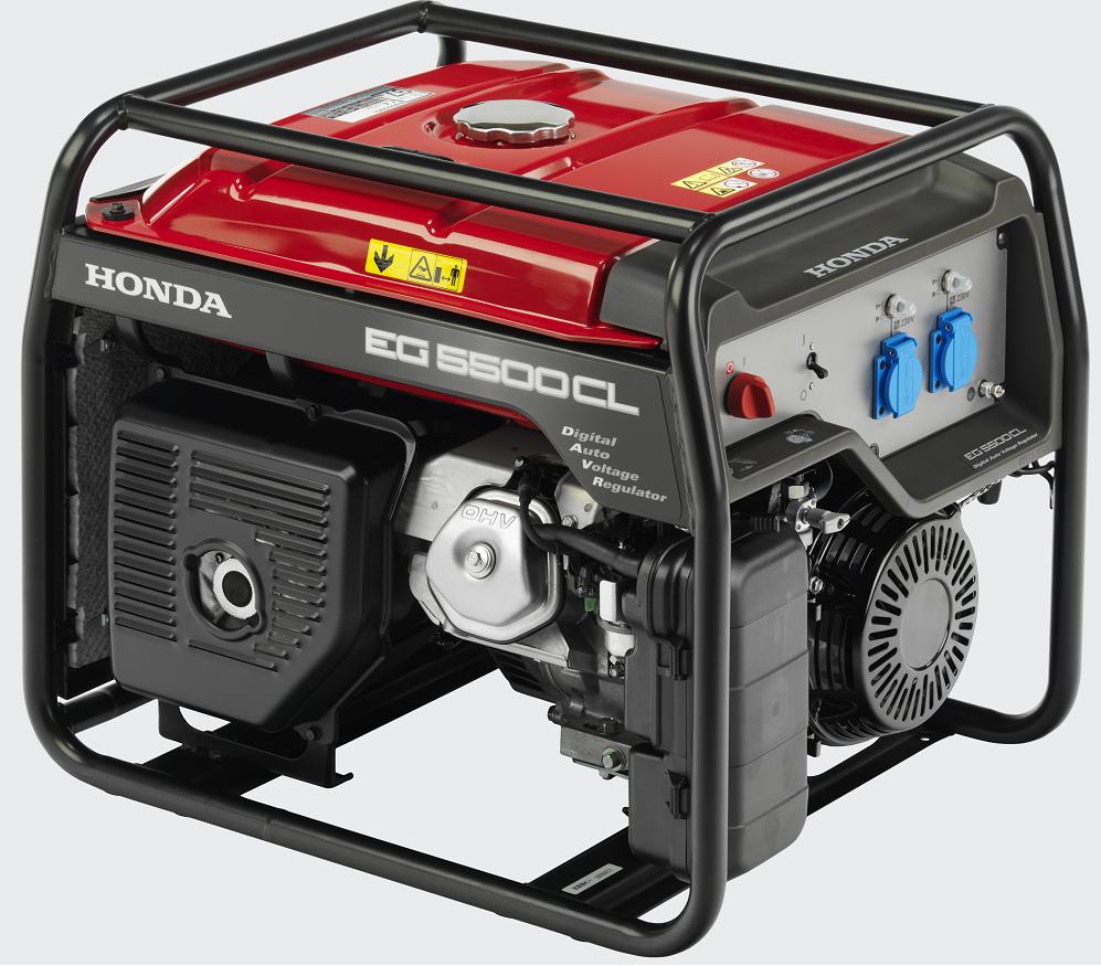 Генератор новейшего поколения EG5500CL характеризует: удобство в использовании, высокое качество электрического тока, которое обеспечивает цифровая регуляция напряжения (D-AVR), квадратные резиновые амортизаторы, размещенные под углом 45°, которые уменьшают вибрации лучше, чем стандартные амортизаторы, размещенные под прямым углом; габаритный топливный бак, обеспечивающий длительное время использования без дополнительного наполнения топлива, 4-х тактный бензиновый мотор внутреннего сгорания Honda серии GX типа OHV нового поколения, демпфированный глушитель.