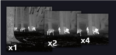 Оптика с германиевым объективом F19/f1.0 имеет один из самых высоких показателей по ширине поля зрения. Угол в 19,5 х 14,7 градусов предоставляет для наблюдения область пространства с линейными размерами 34,4 на 25,8 метров на удалении в 100 метров. Для обзорных наблюдений это одно из лучших решений. Цифровой зум от 1х до 4х позволит приблизить картинку и изучить наблюдаемый объект в мельчайших подробностях.