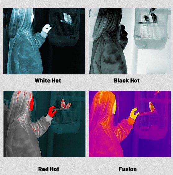 Четыре цветовые палитры. Традиционный набор решений для наблюдений в разных условиях видимости. Стрелок может выбрать оптимальные параметры отображения для решения разных задач при поиске и идентификации. Контрастные оттенки черного и белого наиболее оптимальны при поиске на дальних дистанциях, цветовые палитры с теплыми оттенками лучше подходят  при идентификации на близком расстоянии.
