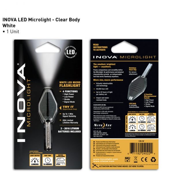 Работающий от 2-х литиевых батарей-таблеток CR2016, фонарь Inova Microlight представляет собой передовые проектные разработки и дизайнерские решения в инструменте размером с брелок для ключей. Microlight оснащен влагоустойчивым ударопрочным корпусом. Универсальное крепление из нержавеющей стали позволяет закрепить фонарь на связку для ключей, рюкзак, и любое подходящее место. месяцев