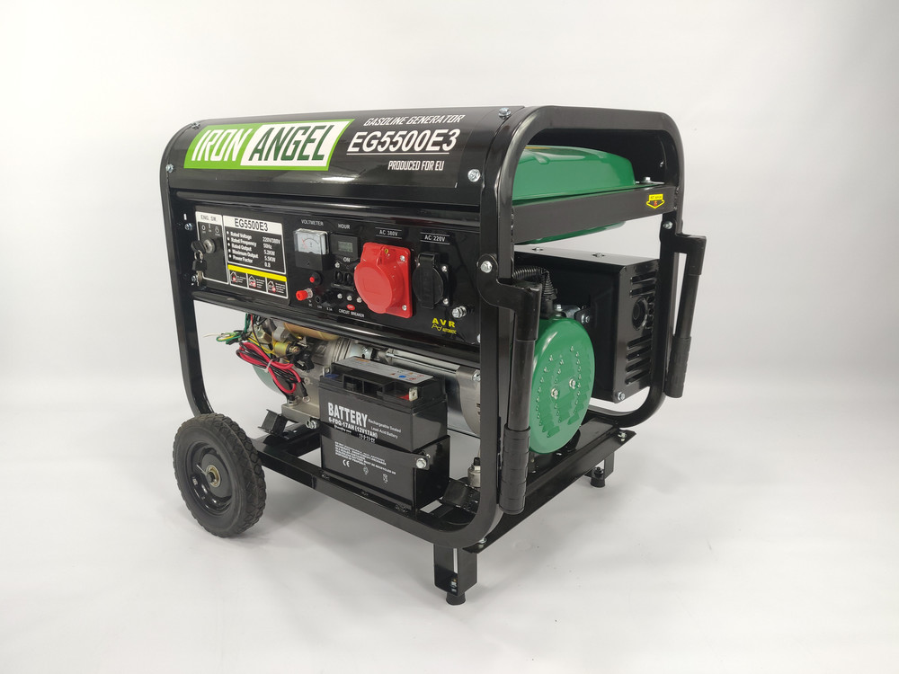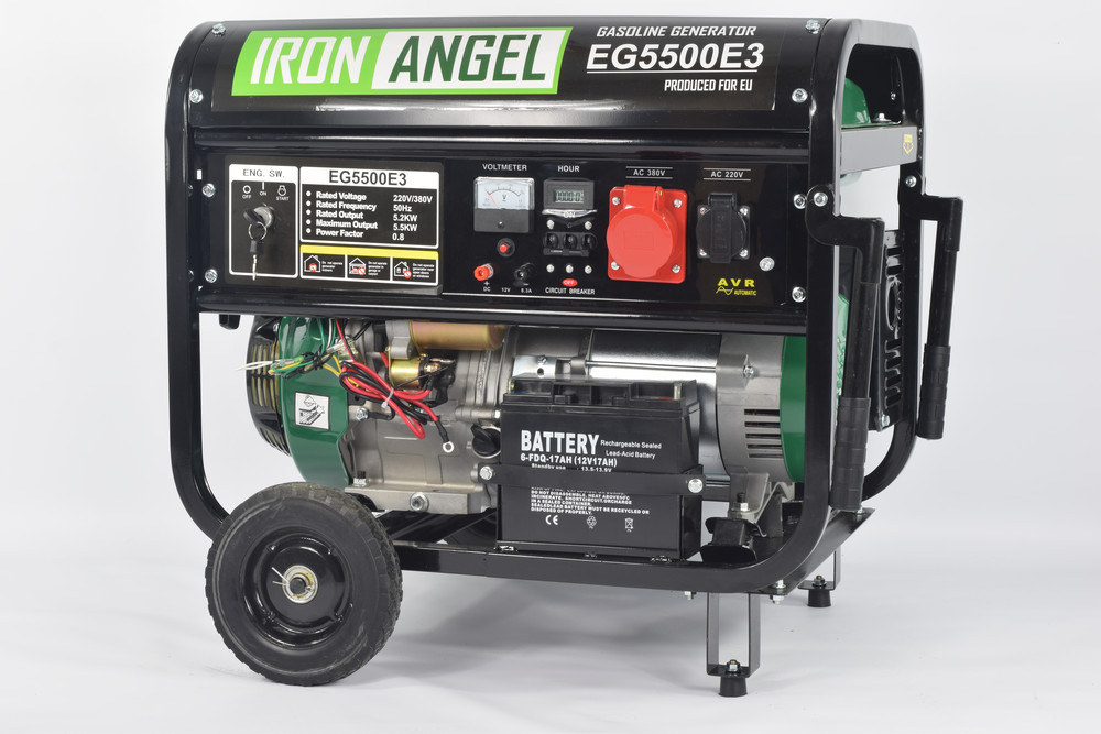 Трехфазный бензиновый генератор Iron Angel EG 5500 E3 предназначен для снабжения энергией сетей с номинальной нагрузкой до 5,2 кВт, хотя установленный синхронный генератор может "выдавать" 5,5 кВт в режиме максимальной нагрузки. Для сетей постоянного тока генерируется напряжение 12 В с максимальным значением тока 8,3 А. Агрегат снабжен автоматической системой стабилизации выходного напряжения (AVR), визуальный контроль потенциала на выходе осуществляется с помощью вольтметра.