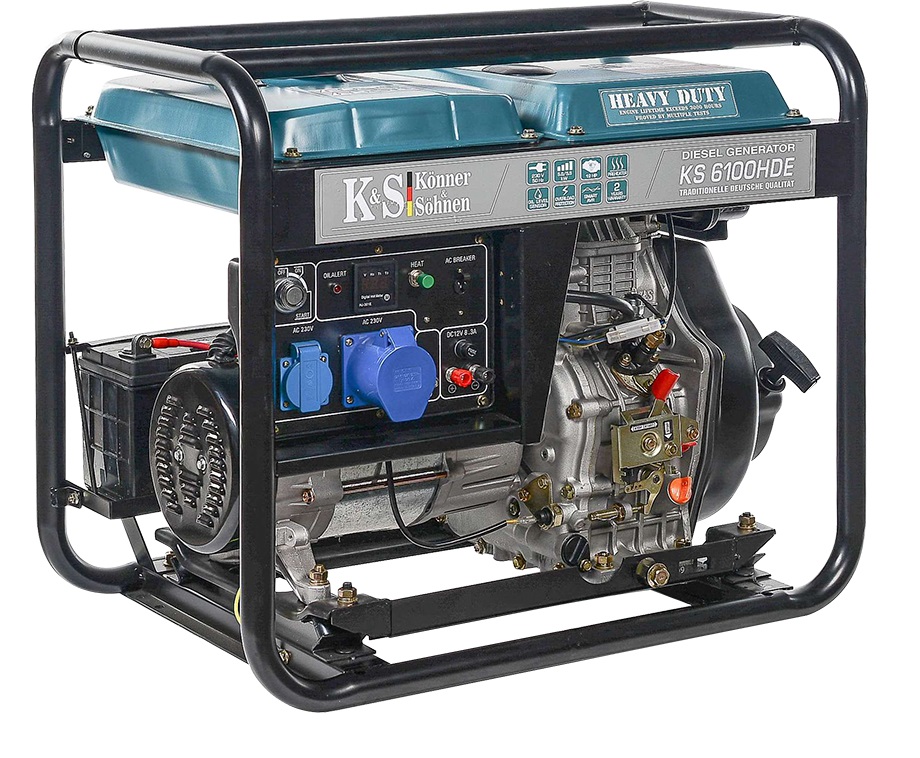 Завдяки додатковому підсиленню рами верхніми захисними планками, генератор професійної серії «HEAVY DUTY» може експлуатуватись у більш жорсткому режимі, посилена рамна конструкція додатково захищає від пошкоджень баку при експлуатації та транспортуванні. Для всіх моделей дизельних генераторів «Könner & Söhnen» в комплект входять додаткові гумові опори для захисту рами від корозії. Завдяки опорам, працюючий генератор не пошкодить покриття підлоги, а фарбування рами не буде подряпане. Також в комплект можна придбати транспортувальний набір. Генератор укомплектований додатковими аксесуарами: вилка переносна 2Р+РЕ 16А 230В, силова вилка переносна 2P+Е 230В, 32А, ключ ріжковий, 8×10 мм, ключ ріжковий, 12×14 мм, ключ ріжковий, 17×19 мм, викрутка двостороння 6.0 мм, РН2.