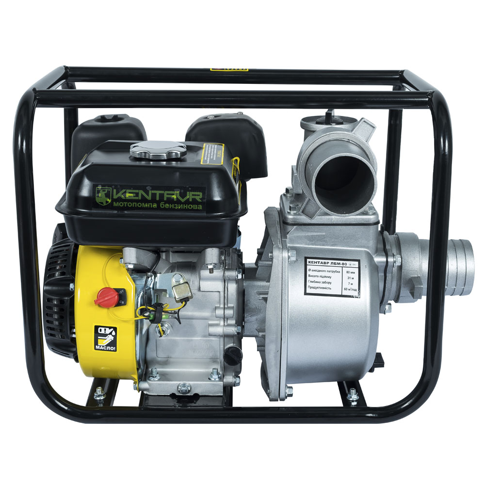 Комплектующие насоса изготовлены из высококачественных материалов – чугунные крыльчатка и диффузор. Перекачивающие рукава одеваются на всасывающий и нагнетательный алюминиевые патрубки диаметром 80 мм. Для надежности соединения рукавов с патрубками в комплект поставки входит набор хомутов, штуцеров, гаек и уплотнителей. Бензиновая мотопомпа ЛБМ-80 осуществляет забор воды с глубины до 8 метров и способна подымать ее на высоту до 31 метров. Производительность устройства напрямую зависит от высоты подъема воды и может достигать 60 м³/ч. Топливный бак емкостью всего 3,6 л, но экономный расход топлива 360 г/квт*час позволяет ей работать без дозаправки долгое время. Двигатель защищен от использования без масла в картере аварийной системой. Встроенный датчик низкого уровня масла отключает систему зажигания и двигатель не работает.