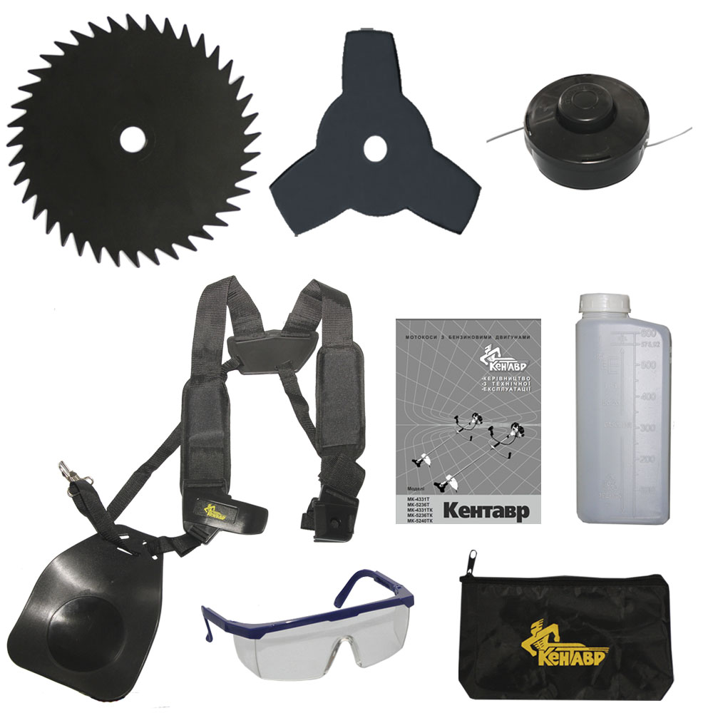 Комплектация: эргономоичная жилетка; шпуля с леской; 3-зубовый нож; защитные очки; 40-зубовый нож
