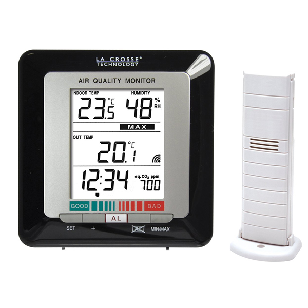 Метеостанция La Crosse WS272-Black предназначена для измерений температуры как внутри помещения, так и снаружи; определяет влажность воздуха и концентрацию углекислого газа для определения комфортности нахождения человека в помещении (повышенное содержание СО2 негативно влияет на общее состояние организма, работоспособность и концентрацию внимания). Поэтому в помещениях, где длительное время находятся люди (офисы, учебные классы и аудитории и т.п.), необходимо контролировать уровень углекислого газа. Метеостанция оснащена датчиком, измеряющим уровень CO2. Превышение допустимого содержания углекислого газа отображается на дисплее на красно-зеленой шкале с обозначениями BAD/GOOD и сопровождается звуковым сигналом