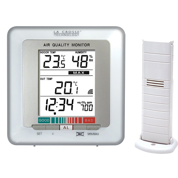 Метеостанция La Crosse WS272-White предназначена для измерений температуры как внутри помещения, так и снаружи; определяет влажность воздуха и концентрацию углекислого газа для определения комфортности нахождения человека в помещении (повышенное содержание СО2 негативно влияет на общее состояние организма, работоспособность и концентрацию внимания). Поэтому в помещениях, где длительное время находятся люди (офисы, учебные классы и аудитории и т.п.), необходимо контролировать уровень углекислого газа. Метеостанция оснащена датчиком, измеряющим уровень CO2. Превышение допустимого содержания углекислого газа отображается на дисплее на красно-зеленой шкале с обозначениями BAD/GOOD и сопровождается звуковым сигналом