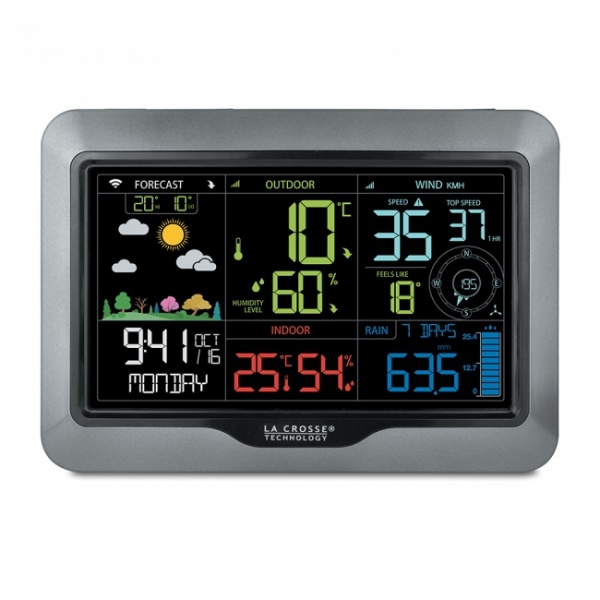 Современная метеостанция LaCrosse WS6867B-BLA (Wi-Fi) с широким спектром функций в современном лаконичном дизайне позволит с равным успехом использовать ее как в квартире, так и на приусадебных участках. Контрастный цветной ЖК-дисплей станции показывает такие важные метеоданные, как прогноз погоды, температуру, влажность, давление, силу и скорость ветра, уровень осадков а также многие другие данные. Встроенная функция тревожных оповещений предупредит вас о выходе измеряемых параметров за указанные пределы.