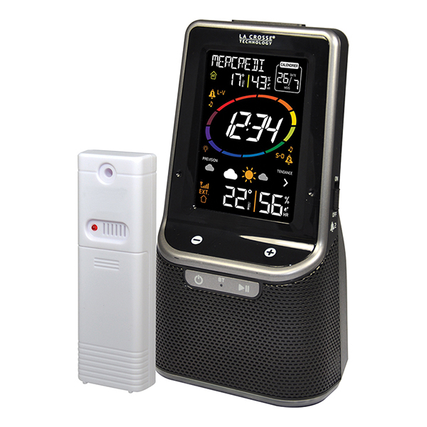 Обеспечивает измерение таких метеопараметров как величина атмосферного давления на основе которого делается прогноз погоды, температура и относительная влажность воздуха внутри и снаружи помешщения, радиоконтролем времени и USB-портом для зарядки мобильных устройств. Станция имеет встроенный динамик. Предусмотрена возможность связи с смартфоном через Bluetooth соединения для воспроизводить музыки. Встроенная функция тревожных оповещений предупредит вас о выходе измеряемых параметров за указанные пределы. радиоконтролем времени, выносным беспроводным термодатчиком и USB-портом для зарядки мобильных устройств.