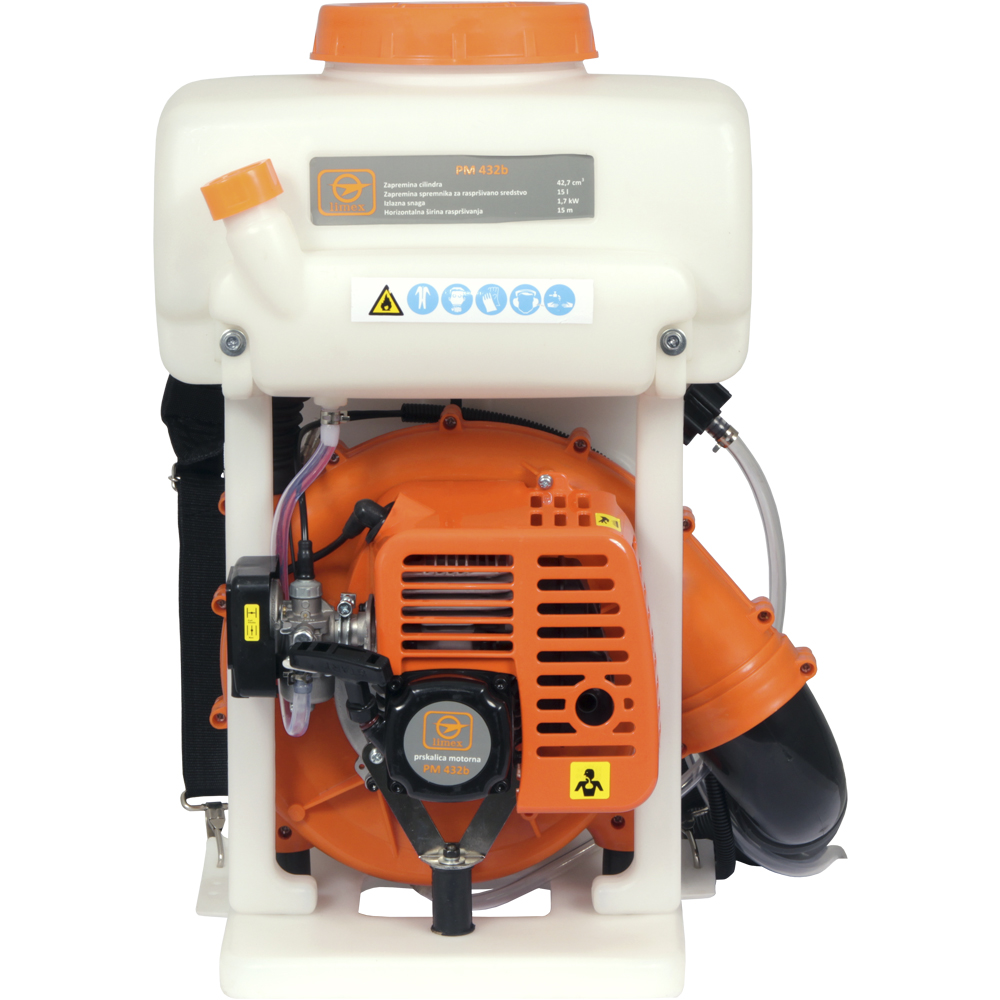 Хорватский бензиновый опрыскиватель Limex PM 432b — это  европейская модель мотоопрыскивателя, которая подходит, как для небольших кустарников, так и для больших деревьев.  В мотоопрыскивателе  установлен двухтактный двигатель с воздушным охлаждением мощностью 2,3 лошадиных силы. Обьем топливного бака составляет 1,3 литра, а бака для препаратов 15литров. Отличительной особенностью данной модели является установленный дополнительный насос, благодаря которому дальность распыления достигает 15 метров!
