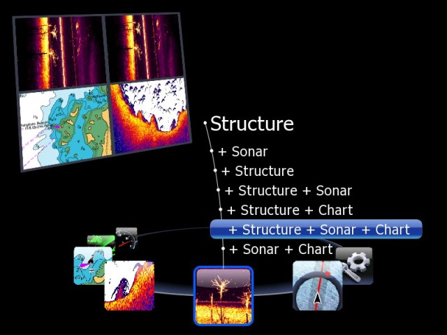 Облегчает восприятие, и поиск нужного раздела. Надпись пункта в меню дублируется изображением соответствующей картинки, это позволяет меньше напрягать голову вспоминая, что означает надпись. Пример на иллюстрации. Раздел «Карта» - внизу по центру светится иконка кусочка карты. К ней мы хотим добавить картинку эхолота – синим, светится название опции. В верхнем левом углу высвечивается графическое изображение такой комбинации. По бокам на колесе, мы видим на иконках расположение других страниц.
