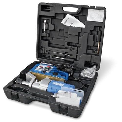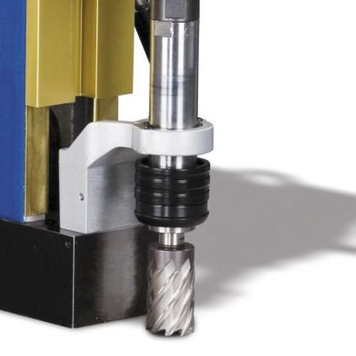 Так как, на станке Metallkraft МВ 754 соединение шпинделя МК3, возможно применение спирального сверла с хвостовиком МК, без применения дополнительных оправок, что положительно сказывается на точности сверления. Максимальный диаметр сверления спиральным сверлом 32 мм, глубина сверления 150 мм. Мощный двигатель 2 кВТ, позволяет длительное использование магнитного сверлильного станка на промышленных предприятиях. 4-е скорости сверления позволяют эффективно использовать магнитный сверлильный станок в различных режимах сверления и различных материалов. Очень немаловажным применение на данном магнитном станке системы подачи охлаждающей жидкости, что положительно влияет на процесс износа инструмента и качество просверленного отверстия. Применение переходных оправок значительно снижает время замены инструмента, что ускоряет процесс сверления. Магнитный сверлильный станок может поставляться, как с комплектом переходных оправок, так и без него.