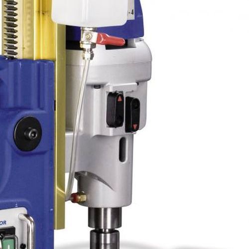 Отличительной особенностью данного сверлильного станка на магните является большое магнитное усилие 32000 Н, что обеспечивает плотное соприкосновение магнитного сверлильного станка к поверхности детали. Корончатые сверла, применяемые на магнитных сверлильных станках, имеет большие преимущества перед спиральными сверлами, так высверливается не вся площадь отверстия, а только окружность корончатого сверла. Результат такого использования — меньшее изнашивание инструмента, меньшая нагрузка на привод сверлильного станка на магните, в несколько раз быстрее происходит процесс сверления. Максимальный диаметр сверления корончатым сверлом 75 мм, хвостовик Weldon 19 мм, при глубине сверления 50 мм.