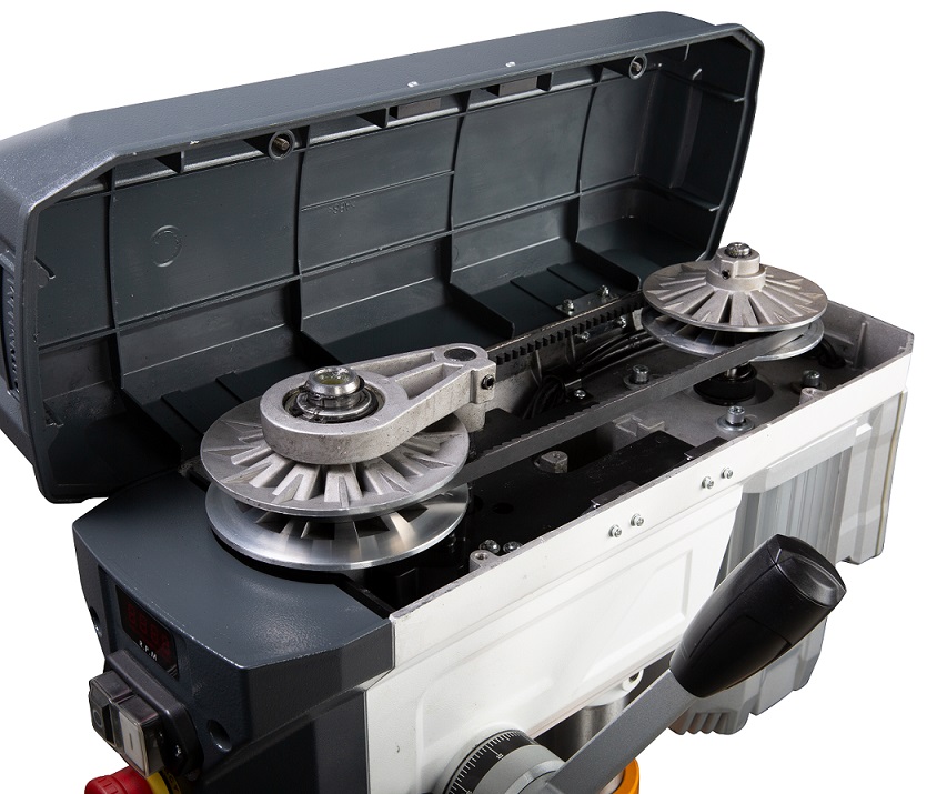 На панели управления сверлильным станком имеется отдельный выключатель аварийной остановки, кнопки «ПУСК/СТОП» соответствующие стандарту безопасности согласно IP 54, электронный дисплей, отображающий обороты шпинделя и выключатель станочного светильника.