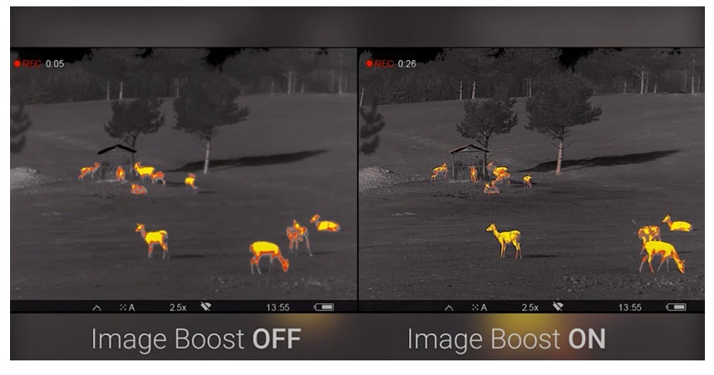 В продукції компанії Pulsar дана опція вперше з'явилася тільки в 2020 році і відразу звернула на себе підвищену увагу. В основі роботи програмної функції Image Detail Boost лежать унікальні і патентовані алгоритми обробки зображення, що дозволяють на порядок підвищити якість картинки. Конвертувати зображення отримало максимальний рівень деталізації. Для спостережень доступні не тільки найдрібніші деталі на поверхні цілі, а й невеликі елементи навколишнього оточення: дрібна трава, листя дерев, шерсть тварин, тінь і так далі. Чи включається опція в меню швидкого доступу.
