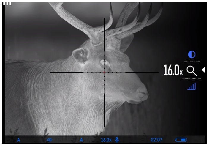 При активации опции PiP (картинка в картинке) на основной экран выводится дополнительное окно меньшего размера с увеличенной центральной областью. Стрелок видит не только увеличенное изображение, но и перекрестье используемой в данный момент сетки. Небольшие размеры окна не мешают визуально контролировать пространство вокруг объекта. По увеличенному изображению значительно проще наводить оружие в убойную зону и определять трофейность животного. Также с ее помощью можно вести прицельный огонь по движущимся с небольшой скоростью целям.
