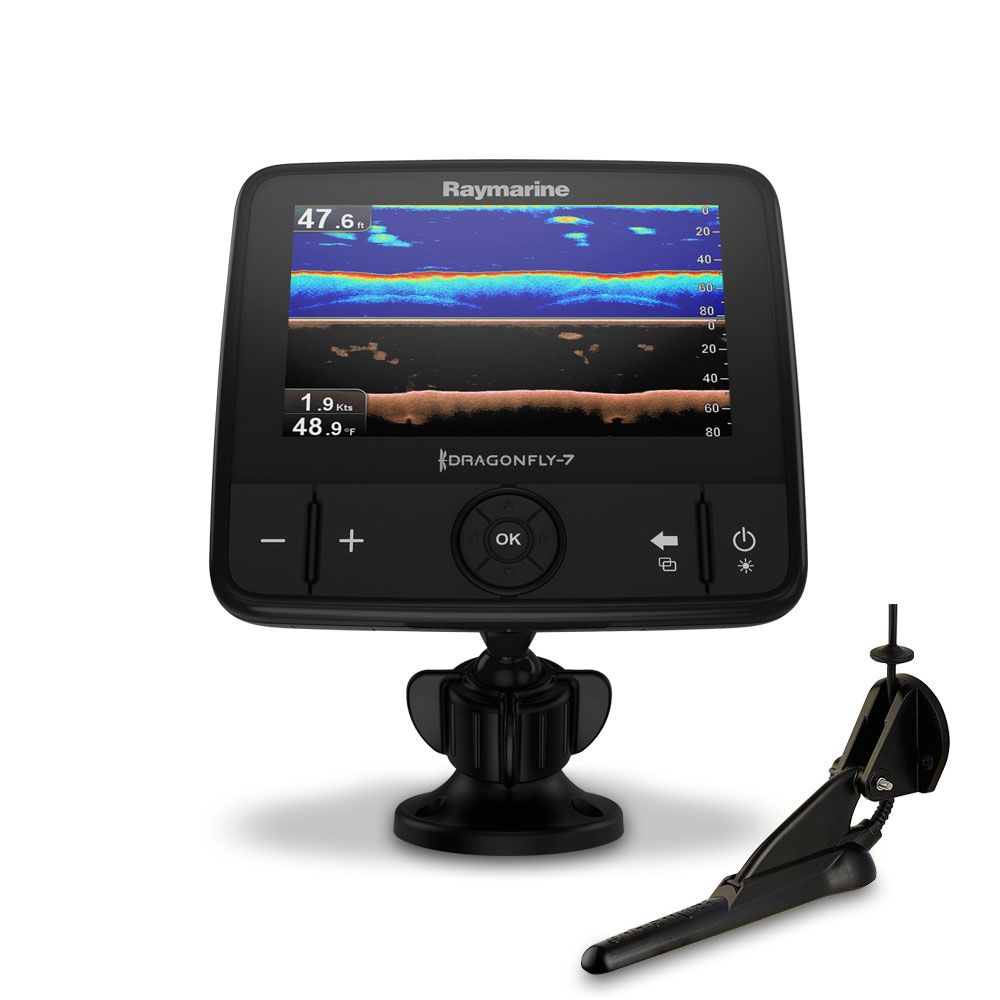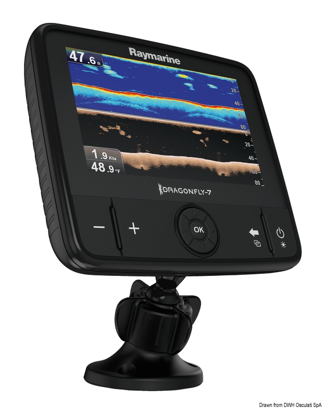 Благодаря компактному поворотно-наклонному кронштейну эхолот Raymarine Dragonfly может быть установлен практически в любом месте на судне.